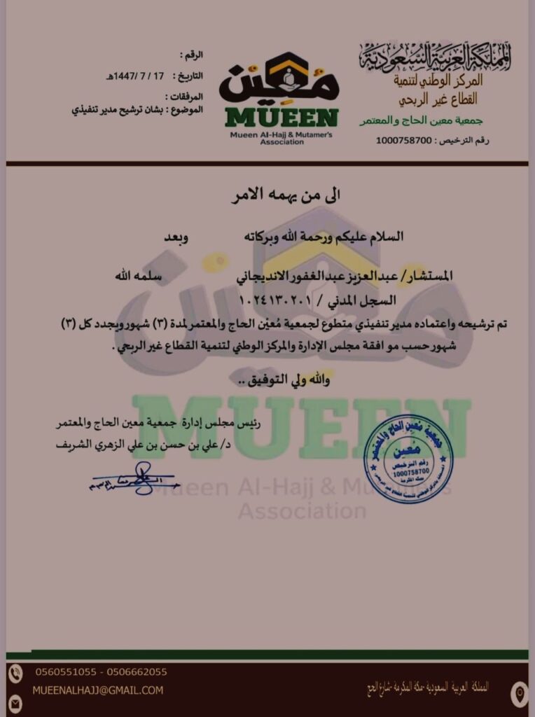 تم اختيار المستشار عبدالعزيز عبدالغفور الانديجاني مديرا تنفيذيا لجمعيه معين الحاج والمعتمر بعد موافقة مجلس، إدارة الجمعيه والمركز الوطني لتنمية القطاع غير الربحي