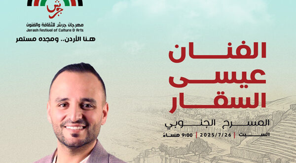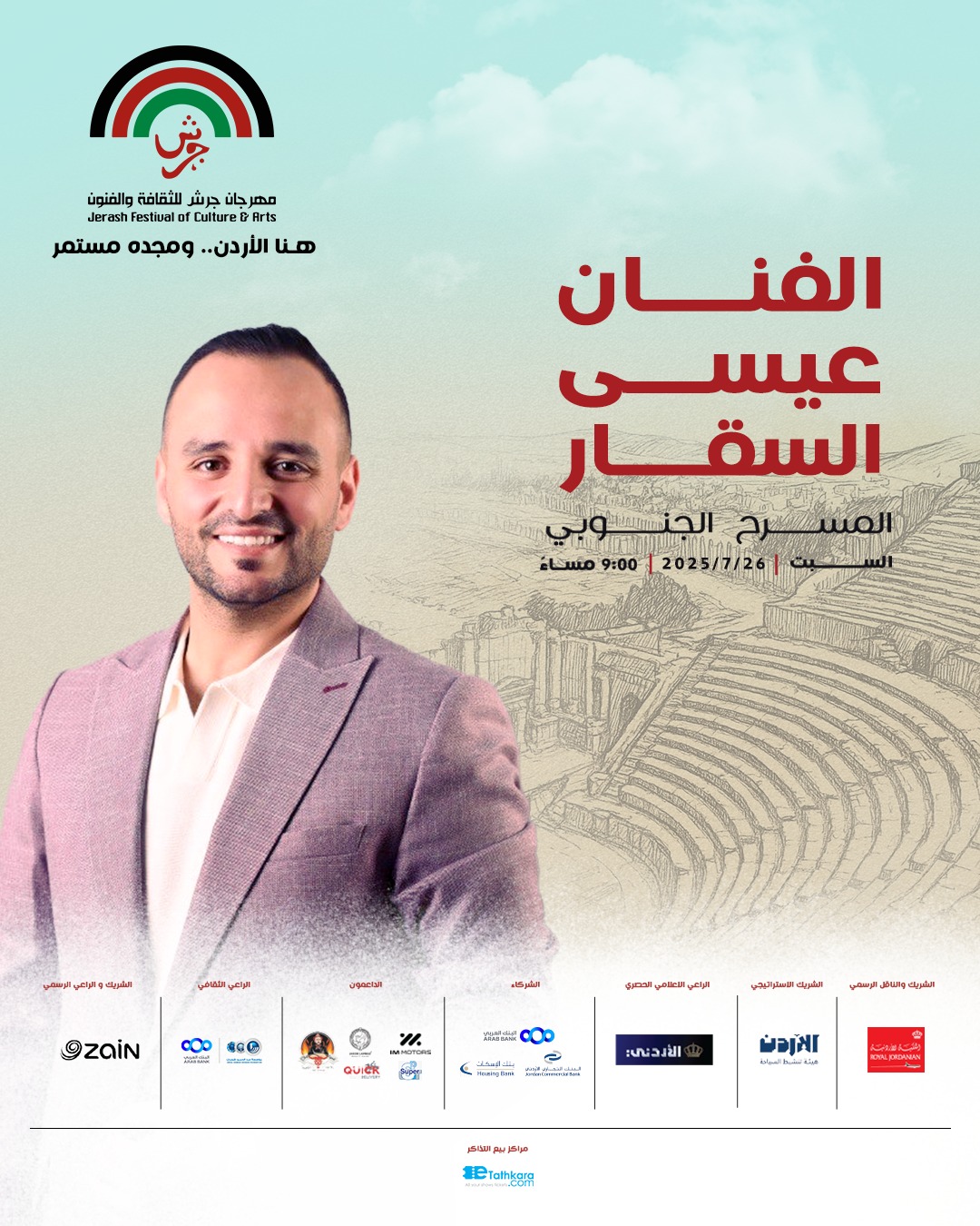 اختارت إدارة “مهرجان جرش للثقافة والفنون”، “سفير الأغنية الأردنية” الفنان عيسى السقار، ليكون نجم حفل “هنا الأردن.. ومجده مستمر”، مساء يوم السبت 26/7/2025، على خشبة المسرح الجنوبي في مدينة جرش، ضمن فعاليات دورة المهرجان التاسعة والثلاثين.